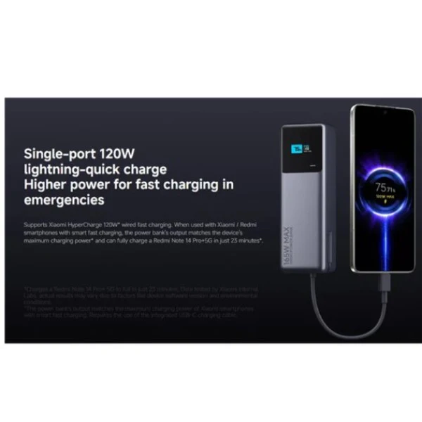 This power bank features dual ports delivering a combined output of up to 165W, enabling simultaneous charging of two devices with optimal speeds of 120W and 45W respectively. It supports Xiaomi Hyper Charge 120W wired fast charging, capable of powering devices like the Redmi Note 14 Pro+5G in just 23 minutes, ideal for rapid recharges. The integrated USB-C cable enhances travel convenience by eliminating the need for extra cords, neatly stored in a dedicated slot that also functions as a lanyard. A smart color display provides clear, color-coded information for effortless monitoring of battery status and charging progress. Compatible with a wide range of devices—including smartphones, tablets, laptops, and gaming consoles like the Nintendo Switch—its advanced controller chip adjusts output power to ensure safe and efficient charging across different gadgets.